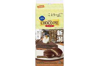 タルトショコラ>「ことりっぷ」とコラボした小さなチョコパイ。新潟市の沼垂テラス商店街にある人気カフェ「編むと紡ぐ」の「焙じ茶のタルトショコラ」の味わいを表現しました。焙じ茶パウダーを配合したクリームを、チョコレートを練り込んだ生地でサンドし、焙じ茶とチョコレートの味わいをバランスよく楽しめるように仕立てました。