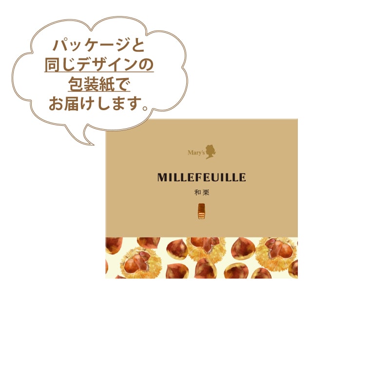 チョコレート(砂糖、全粉乳、ココアバター、カカオマス、植物油脂)(国内製造)、栗クリーム(植物油脂、乳糖、砂糖、その他)、小麦粉、マーガリン、ショートニング、植物油脂、砂糖、食塩/香料、乳化剤、着色料(カロテノイド)、(一部に小麦・乳成分・アーモンド・大豆を含む)