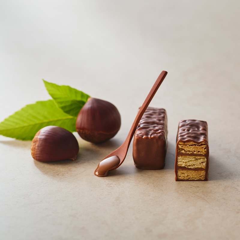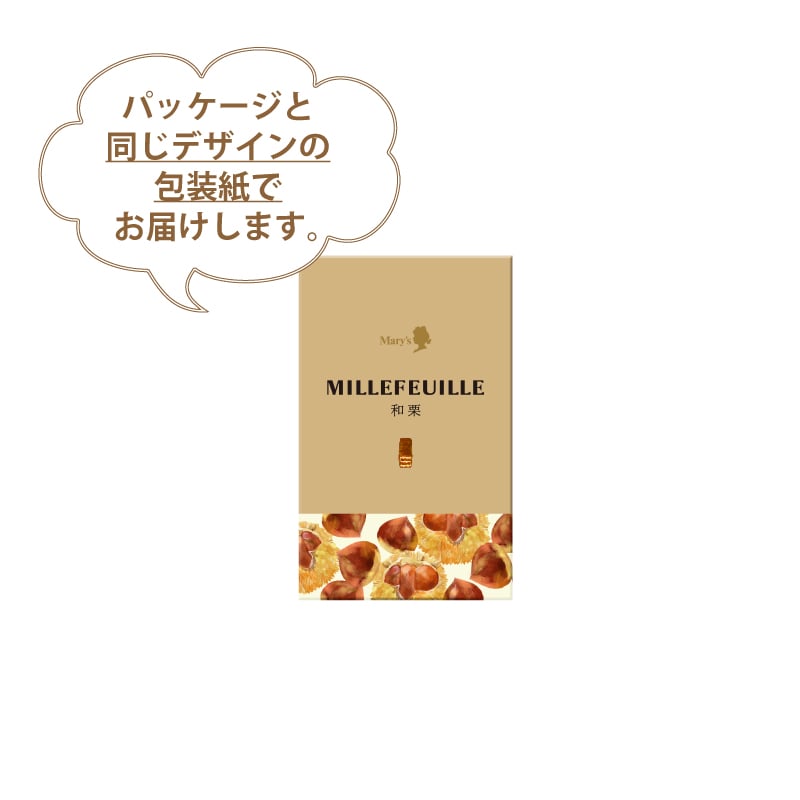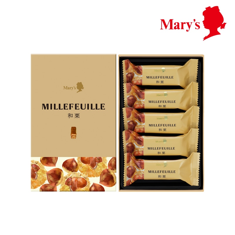チョコレート(砂糖、全粉乳、ココアバター、カカオマス、植物油脂)(国内製造)、栗クリーム(植物油脂、乳糖、砂糖、その他)、小麦粉、マーガリン、ショートニング、植物油脂、砂糖、食塩/香料、乳化剤、着色料(カロテノイド)、(一部に小麦・乳成分・アーモンド・大豆を含む)