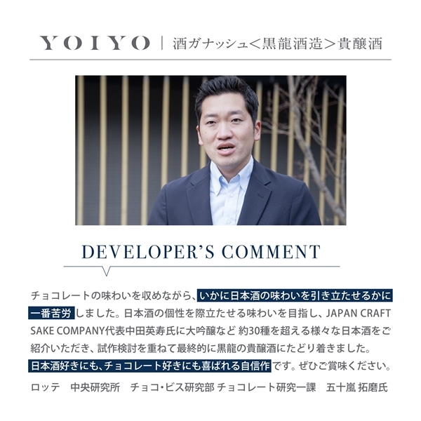 カカオマス(カカオ豆(ガーナ、ベネズエラ))、砂糖、日本酒、植物油脂、ココアバター、乳糖、ココアパウダー、全粉乳、還元水あめ、マルトデキストリン/グリセリン、乳化剤(大豆由来)、香料