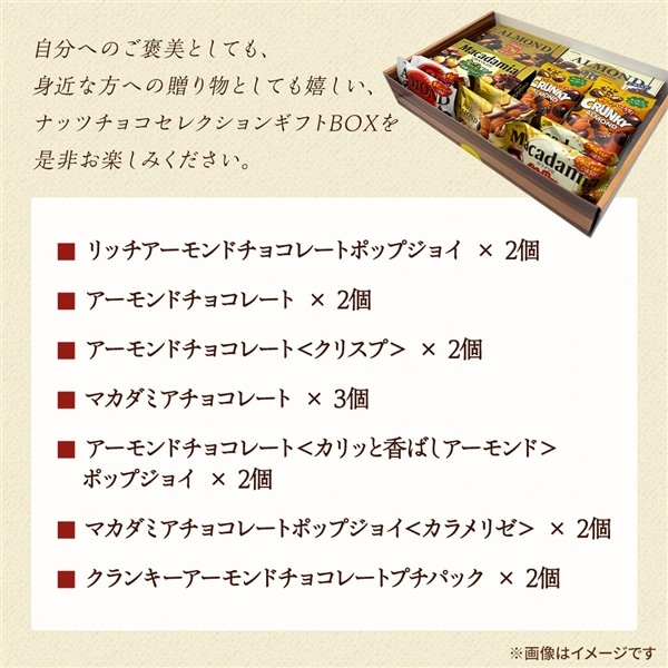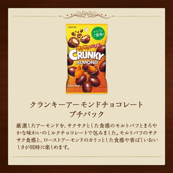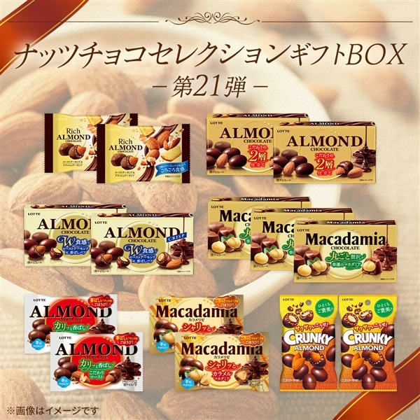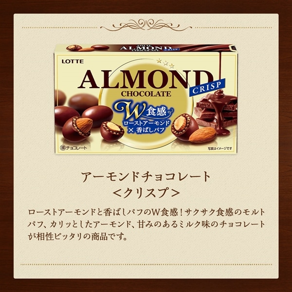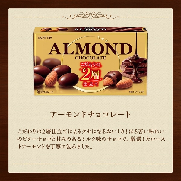 ローストアーモンド(国内製造)、砂糖、全粉乳、カカオマス、モルトパフ(小麦粉、でん粉、モルトエキス、食塩)、植物油脂、ココアバター、乳糖、水あめ、食塩/乳化剤(大豆由来)、光沢剤、増粘剤(アラビアガム)、香料、膨脹剤、カラメル色素