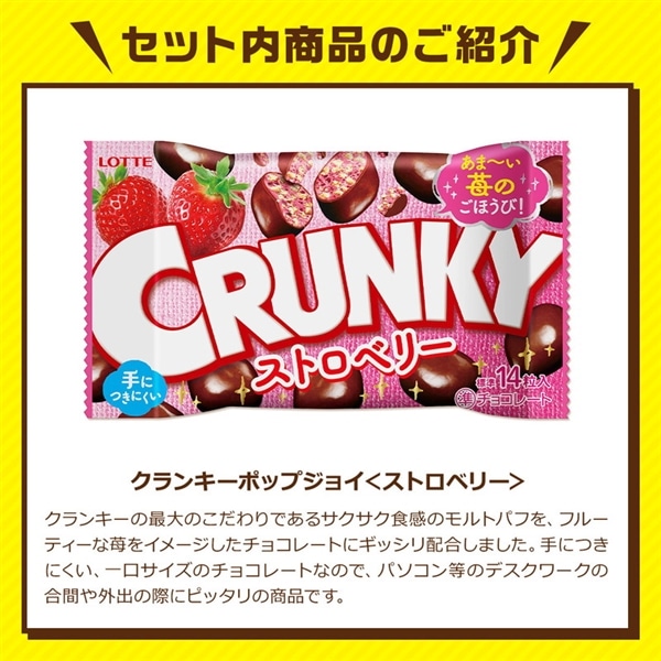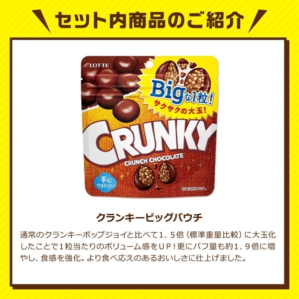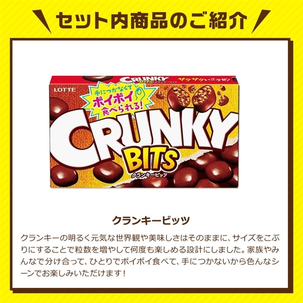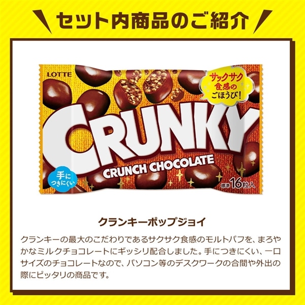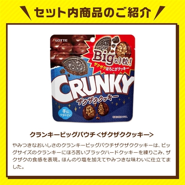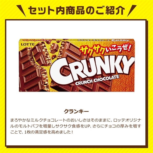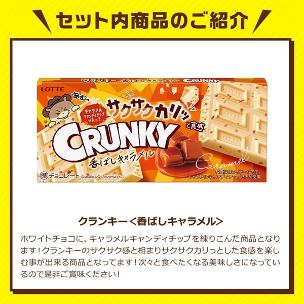 砂糖(国内製造)、植物油脂、全粉乳、カカオマス、乳糖、ココアビスケットクランチ(小麦粉、砂糖、ショートニング、ぶどう糖果糖液糖、ココアパウダー、食塩)、小麦粉、プレッツェルクランチ(大豆を含む)、でん粉、ココアバター、食塩、モルトエキス/トレハロース、乳化剤、膨脹剤、香料、調味料(アミノ酸等)、カラメル色素