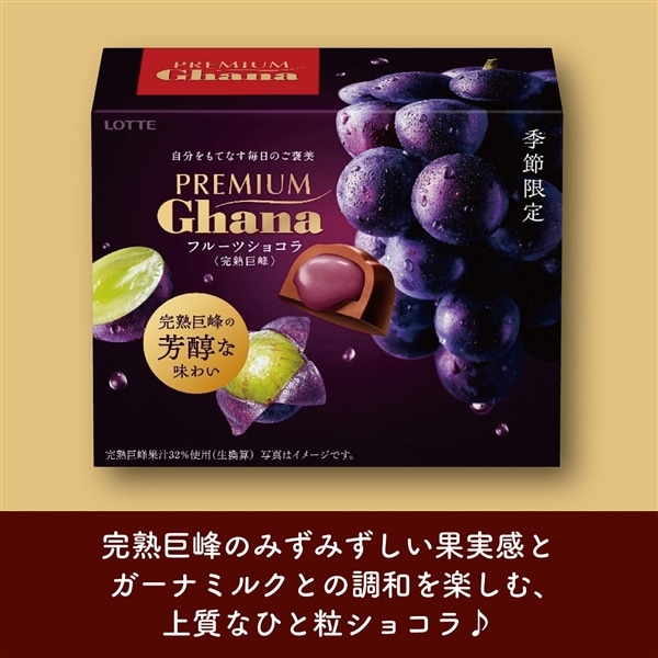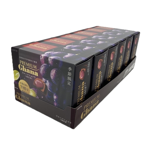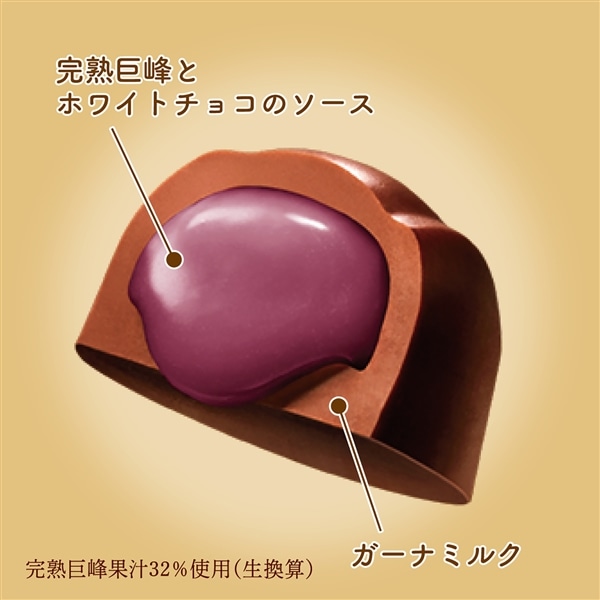 砂糖(国内製造)、全粉乳、カカオマス、ココアバター、植物油脂、ぶどうソース(果糖、水あめ、濃縮ぶどう果汁)、濃縮ぶどう果汁、還元水あめ、乳糖、洋酒/ソルビトール、トレハロース、乳化剤(大豆由来)、酒精、香料、酸味料、増粘剤(加工でん粉、ペクチン)、着色料(クチナシ、紅麹)、酸化防止剤(ビタミンE、ヤマモモ抽出物)