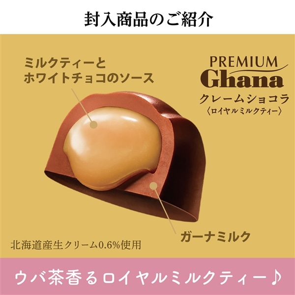 砂糖(国内製造)、全粉乳、カカオマス、ココアバター、植物油脂、ミルクティーソース(果糖、水あめ、クリーム、紅茶エキスパウダー、油脂加工品、紅茶粉末)、還元水あめ、乳糖、洋酒/ソルビトール、トレハロース、乳化剤(大豆由来)、酒精、香料、増粘多糖類、pH調整剤、酸化防止剤(ビタミンE、ヤマモモ抽出物)、コウリャン色素