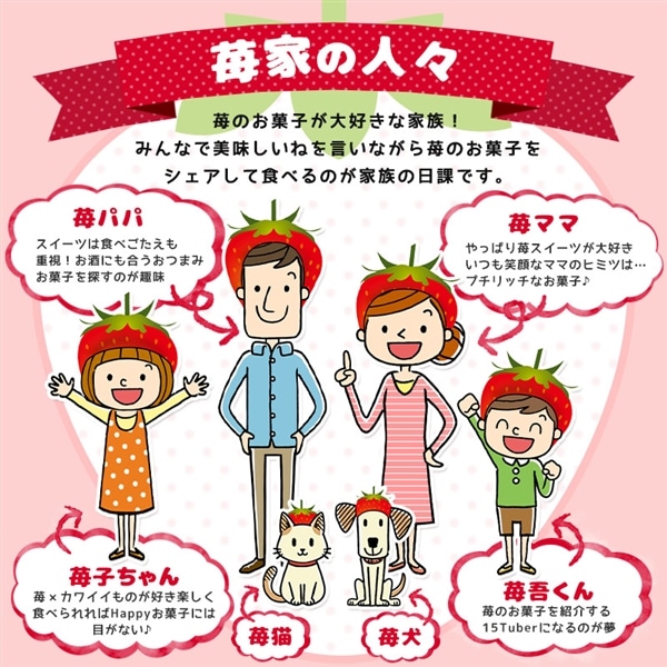 砂糖(国内製造)、小麦粉、植物油脂、乳糖、でん粉、ショートニング、ココアバター、全粉乳、ホエイパウダー、液卵、マルチトール、ストロベリーパウダー、クリームパウダー、食塩/炭酸Ca、膨脹剤、着色料(カラメル、紅麹、アカビート)、香料、乳化剤(大豆由来)