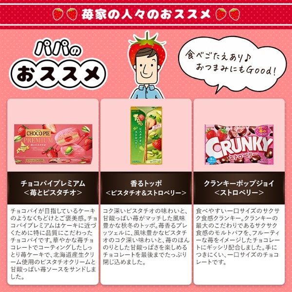 砂糖(国内製造)、全粉乳、カカオマス、ココアバター、植物油脂、苺ソース(果糖、水あめ、濃縮苺果汁)、濃縮苺果汁、還元水あめ、乳糖、洋酒/ソルビトール、トレハロース、乳化剤(大豆由来)、酒精、酸味料、香料、増粘剤(加工でん粉)、着色料(クチナシ、パープルキャロット、紅花黄、カラメル)、酸化防止剤(ビタミンE、ヤマモモ抽出物)