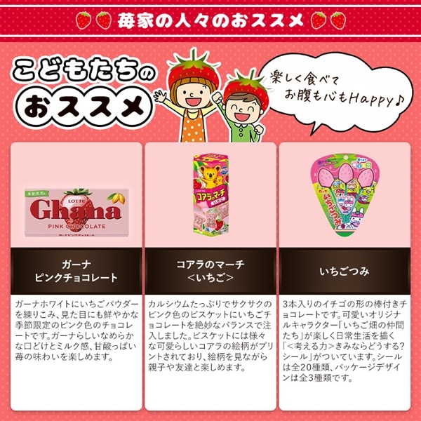 砂糖(国内製造)、植物油脂、乳糖、全粉乳、カカオマス、ココアバター、れん乳パウダー、ストロベリーパウダー/乳化剤(大豆由来)、アカビート色素、香料