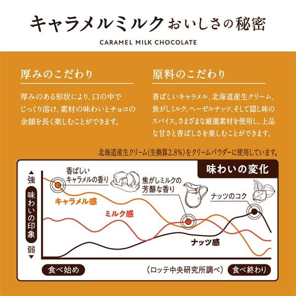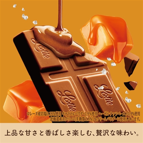 砂糖(国内製造)、全粉乳、ココアバター、植物油脂、ミルククラム(砂糖、全粉乳、ココアバター)、カカオマス、乳糖、クリームパウダー、キャラメルパウダー、ヘーゼルナッツペースト、塩シーズニング、食塩、香辛料/乳化剤、香料、(一部に乳成分・小麦・大豆を含む)