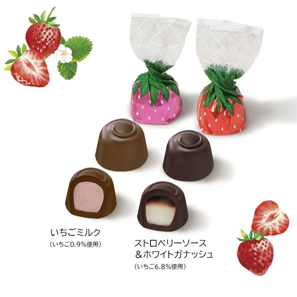 チョコレート(砂糖、ココアバター、全粉乳、カカオマス、植物油脂、その他)(国内製造)、還元水あめ、いちごソース(麦芽糖、還元水あめ、砂糖、水あめ、いちご濃縮果汁)、カカオマス、植物油脂、水あめ、ストロベリーパウダー/乳化剤、トレハロース、酸味料、香料、ゲル化剤(ペクチン)、着色料(アントシアニン、赤102)、(一部に乳成分・大豆を含む)