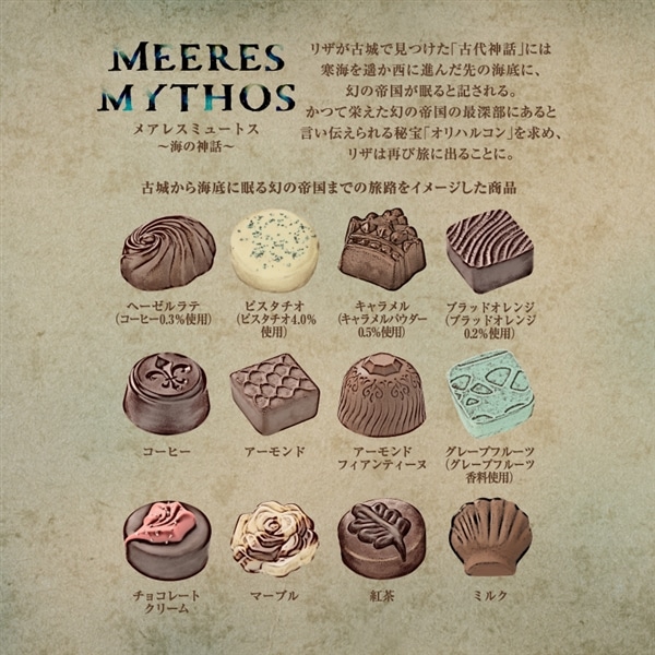 チョコレート(砂糖、ココアバター、全粉乳、カカオマス、乳糖、植物油脂、その他)(国内製造)、カカオマス、植物油脂、アーモンドペースト、砂糖、ショートニング、ヘーゼルナッツペースト、アーモンドペースト、ピスタチオナッツペースト、ココアバター、乳糖、アーモンド、フィヤンティーヌ、コーヒー、全粉乳、紅茶パウダー、キャラメルパウダー、ブラッドオレンジ果汁パウダー、水あめ、食塩/乳化剤、香料、トレハロース、着色料(銀箔、赤40、紅花赤、カロテン、青1、金箔)、酸味料、グリセリン、(一部に小麦・乳成分・アーモンド・オレンジ・大豆を含む)