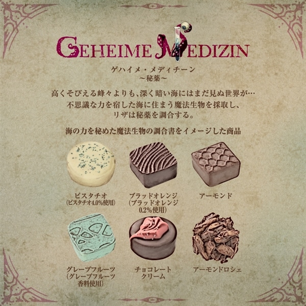 チョコレート(砂糖、ココアバター、全粉乳、カカオマス、乳糖、植物油脂、その他)(国内製造)、アーモンド、カカオマス、植物油脂、アーモンドペースト、ショートニング、アーモンドペースト、ピスタチオナッツペースト、砂糖、ブラッドオレンジ果汁パウダー、ココアバター、食塩/乳化剤、香料、トレハロース、着色料(銀箔、赤40、紅花赤、カロテン、青1、金箔)、酸味料、グリセリン、(一部に小麦・乳成分・アーモンド・オレンジ・大豆を含む)