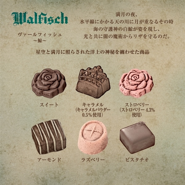 チョコレート(砂糖、ココアバター、全粉乳、カカオマス、乳糖、植物油脂、その他)(国内製造)、カカオマス、植物油脂、ラズベリーパウダー、キャラメルパウダー、ストロベリーパウダー、砂糖/乳化剤、香料、酸味料、着色料(紅花赤、銀箔)、(一部に小麦・乳成分・アーモンド・大豆・マカダミアナッツを含む)