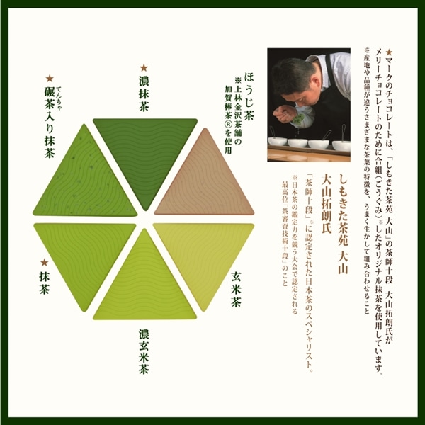 チョコレート(ココアバター、全粉乳、砂糖、乳糖、その他)(国内製造)、植物油脂、抹茶、玄米茶パウダー、ほうじ茶、ほうじ茶パウダー、てん茶/乳化剤、香料、着色料(クチナシ、ウコン)、(一部に乳成分・大豆を含む)
