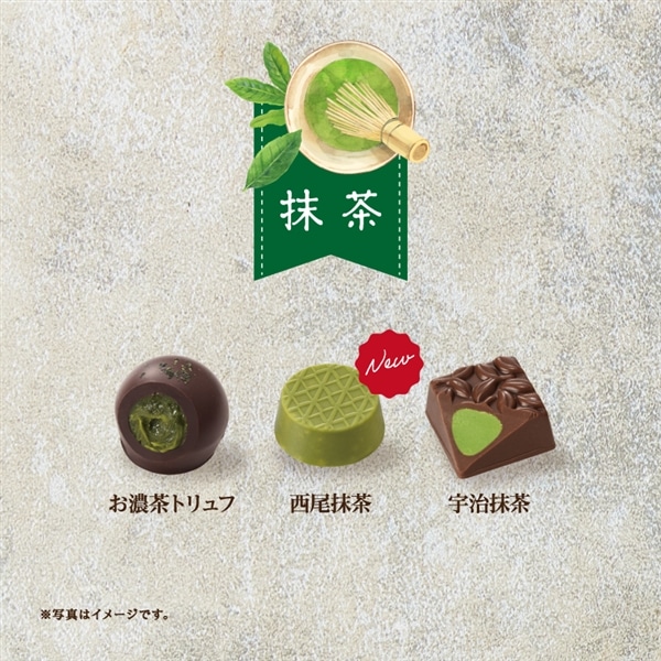 チョコレート(砂糖、ココアバター、全粉乳、カカオマス、乳糖、植物油脂)(国内製造)、植物油脂、還元水あめ、カカオマス、抹茶、モルトパフ、乳等を主要原料とする食品、ショートニング、ジン、てん茶/乳化剤、香料、膨脹剤、着色料(クチナシ、ウコン)、(一部に小麦・乳成分・大豆を含む)