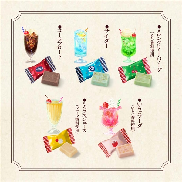 チョコレート(ココアバター、全粉乳、砂糖、乳糖、その他)(国内製造)、キャンディ(砂糖、水あめ、その他)、植物油脂、バナナパウダー/乳化剤、香料、着色料(アントシアニン、紅花赤、クチナシ、カロテノイド、ウコン、青1、りんご果汁)、酸味料、炭酸ガス、(一部に乳成分・大豆・バナナ・りんごを含む)