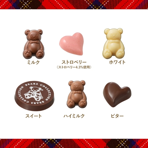 チョコレート(砂糖、ココアバター、カカオマス、全粉乳、乳糖、植物油脂)(国内製造)、カカオマス、植物油脂、ストロベリーパウダー/乳化剤、香料、着色料(酸化チタン、紅花赤)、酸味料、(一部に乳成分・大豆を含む)