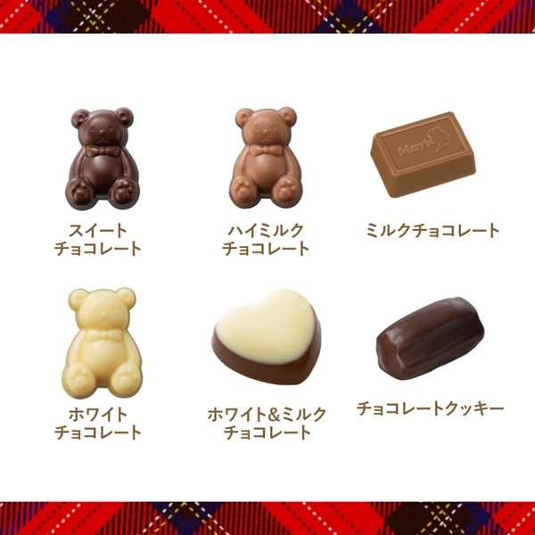 チョコレート(砂糖、ココアバター、全粉乳、カカオマス、植物油脂、乳糖、その他)(国内製造)、クッキー(小麦粉、ショートニング、砂糖、その他)、カカオマス、植物油脂/乳化剤、香料、膨脹剤、(一部に小麦・卵・乳成分・大豆を含む)
