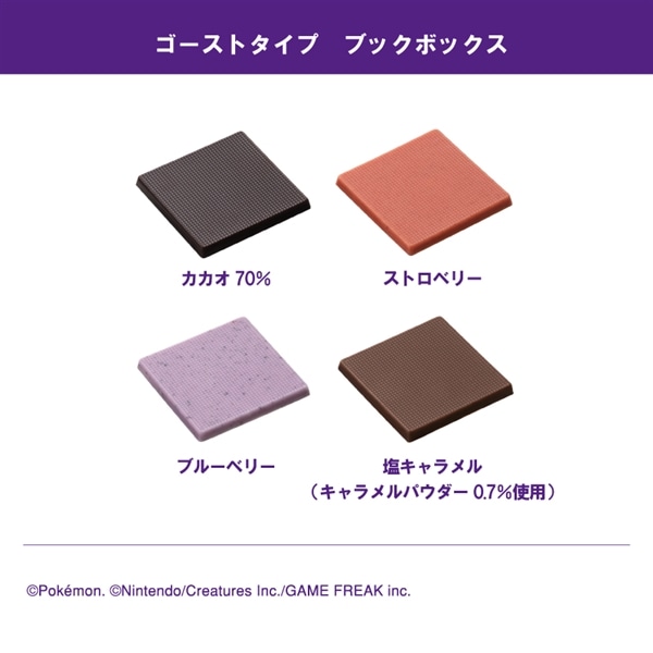 チョコレート(砂糖、ココアバター、全粉乳、乳糖、カカオマス、植物油脂)(国内製造)、カカオマス、植物油脂、ブルーベリーパウダー、ストロベリーパウダー、キャラメルパウダー、食塩/乳化剤、香料、着色料(アントシアニン、クチナシ、赤102)、酸味料、(一部に乳成分・大豆を含む)