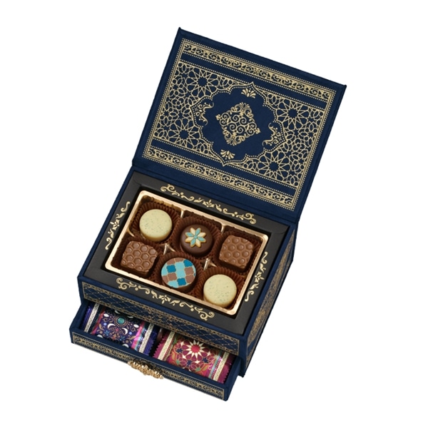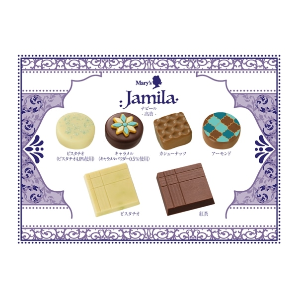 チョコレート(砂糖、ココアバター、全粉乳、乳糖、カカオマス、植物油脂)(国内製造、ベトナム製造)、植物油脂、ピスタチオナッツペースト、カシューナッツペースト、アーモンドペースト、ピスタチオナッツ、ショートニング、カカオマス、アーモンドペースト、砂糖、紅茶パウダー、キャラメルパウダー/乳化剤、香料、着色料(銀箔、酸化チタン、黄4、青1、黄5、赤3、炭末)、(一部に乳成分・アーモンド・カシューナッツ・大豆を含む)