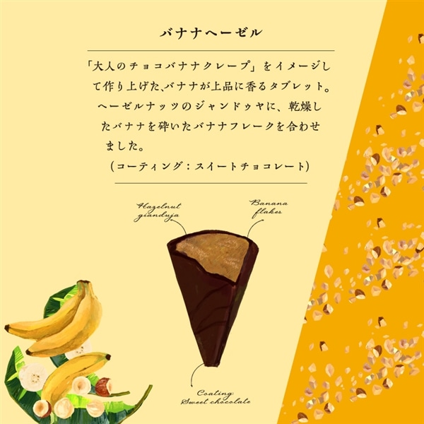 チョコレート(砂糖、カカオマス、ココアバター、植物油脂、その他)(国内製造)、ヘーゼルナッツペースト加工品(ヘーゼルナッツ、全粉乳、砂糖、ココアバター、その他)、砂糖、ヘーゼルナッツペースト、カカオマス、ココアバター、乳糖、乾燥バナナ、植物油脂、アーモンドオイル加工品/乳化剤、香料、(一部に乳成分・アーモンド・大豆・バナナを含む)