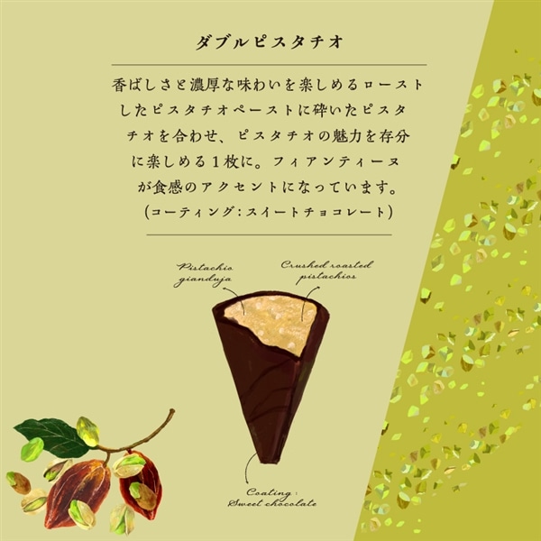 チョコレート(砂糖、ココアバター、カカオマス、全粉乳、乳糖、植物油脂)(国内製造)、カカオマス、ピスタチオナッツペースト、植物油脂、フィヤンティーヌ、ピスタチオナッツ、アーモンドオイル加工品/乳化剤、香料、(一部に小麦・乳成分・アーモンド・大豆を含む)