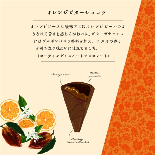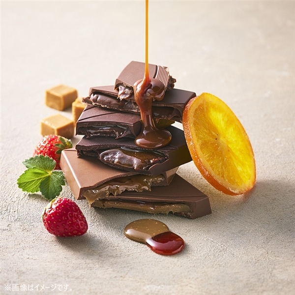チョコレート(砂糖、カカオマス、ココアバター、植物油脂、その他)(国内製造)、還元水あめ、オレンジソース(麦芽糖、還元水あめ、砂糖、オレンジ、水あめ、洋酒)、カカオマス、植物油脂、加糖脱脂れん乳、ココアパウダー/トレハロース、乳化剤、酸味料、香料、増粘剤(ペクチン)、着色料(紅花黄、β-カロテン)、(一部に乳成分・オレンジ・大豆を含む)