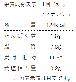 砂糖(国内製造)、バター、液卵白(卵を含む)、アーモンドパウダー、小麦粉、還元水飴、蜂蜜、食塩/膨張剤