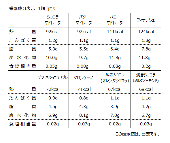【ショコラマドレーヌ】液卵(国内製造)、砂糖、小麦粉、植物油脂、チョコレート、牛乳、水飴、クリーム、ショートニング、バター、蜂蜜、ココアパウダー、でん粉、食塩/トレハロース、乳化剤(大豆由来)、膨張剤、香料