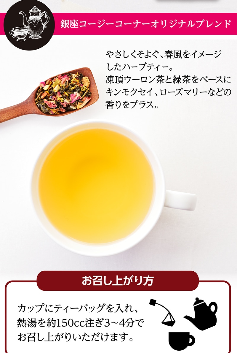 凍頂烏龍茶(台湾製造)、釜煎り緑茶、キンモクセイ、ドライアップル、みかんピール、ローズマリー、ローズレッド、エルダーフラワー、リンデン、ラベンダー/香料