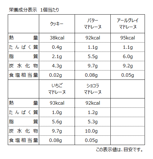 【アールグレイマドレーヌ】液卵(国内製造)、小麦粉、砂糖、植物油脂、マーガリン、ショートニング、クリーム(乳成分を含む)、還元水飴、でん粉、紅茶葉/トレハロース、乳化剤、膨張剤、香料
