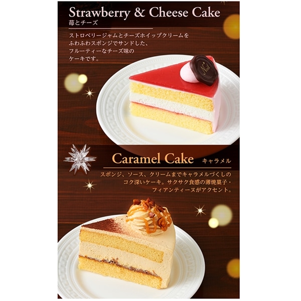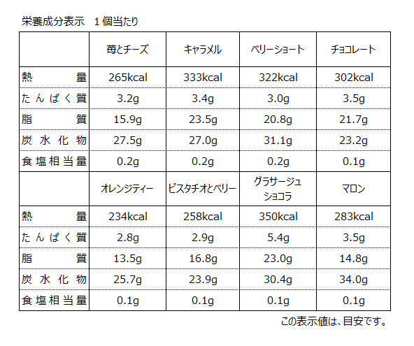 【苺とチーズ】乳等を主要原料とする食品 (国内製造)、砂糖、液卵、小麦粉、水飴、ナチュラルチーズ、苺、チョコレート、クリーム、ナパージュ、ラズベリーピューレ、液糖、麦芽糖、脱脂濃縮乳、加工油脂、植物油脂、バター、でん粉/着色料 (紅花赤、ラック、クエルセチン、カロチノイド、V.B2)、乳化剤、糊料 (増粘多糖類、加工デンプン)、グリセリン、酸味料、膨張剤、トレハロース、香料、メタリン酸 Na、(一部に小麦・卵・乳成分・オレンジ・大豆・りんごを含む)